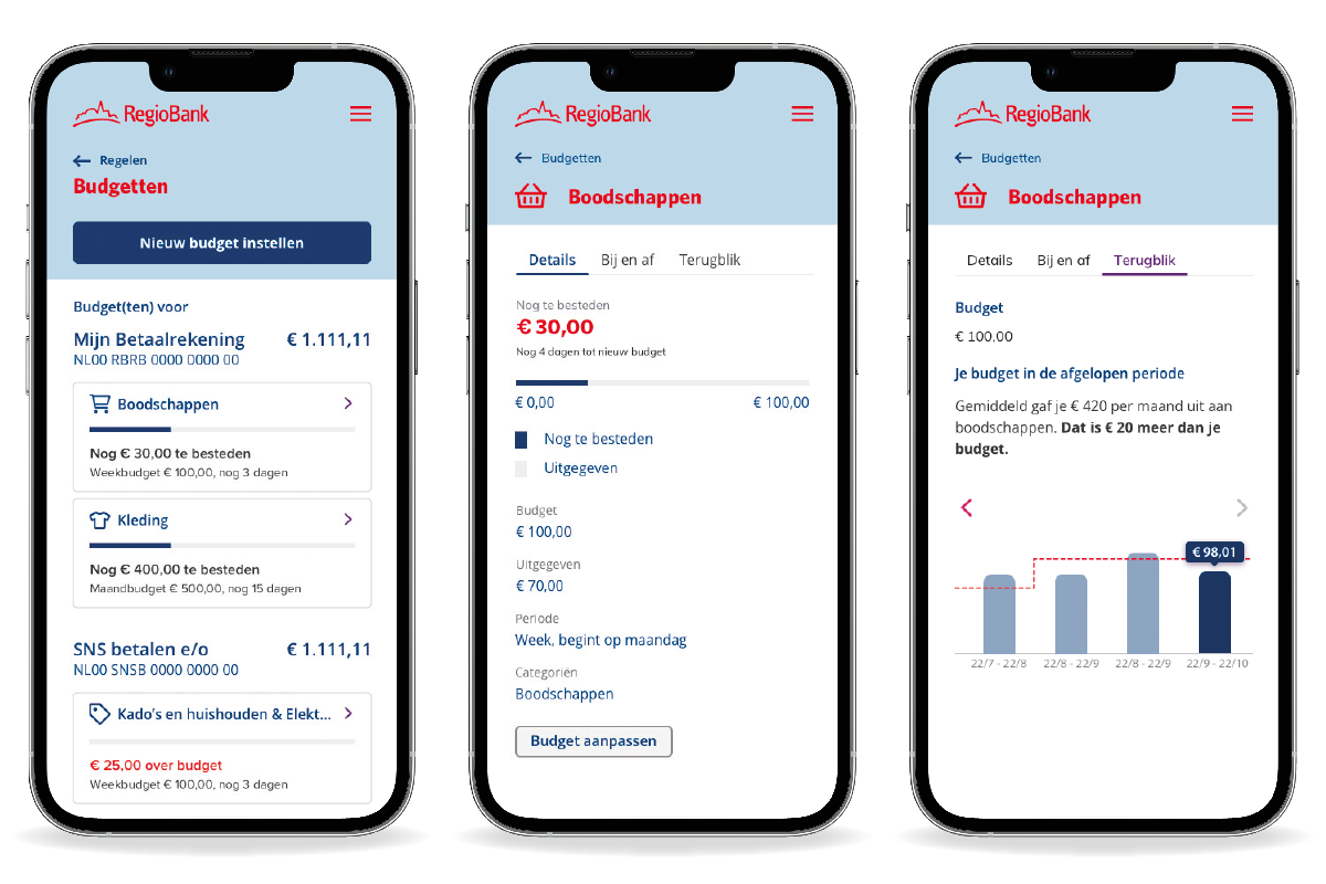 Onder ‘Terugblik’ (zie rechterafbeelding hierboven) kun je periodes met elkaar vergelijken. Je ziet per maand hoeveel je bijvoorbeeld aan boodschappen hebt uitgegeven en of je binnen je budget bleef of niet. Zo weet je voortaan wat de dure en minder dure maanden zijn en wanneer je extra moet opletten. Goed om te weten: Terugblik zit op dit moment alleen in Mijn RegioBank.