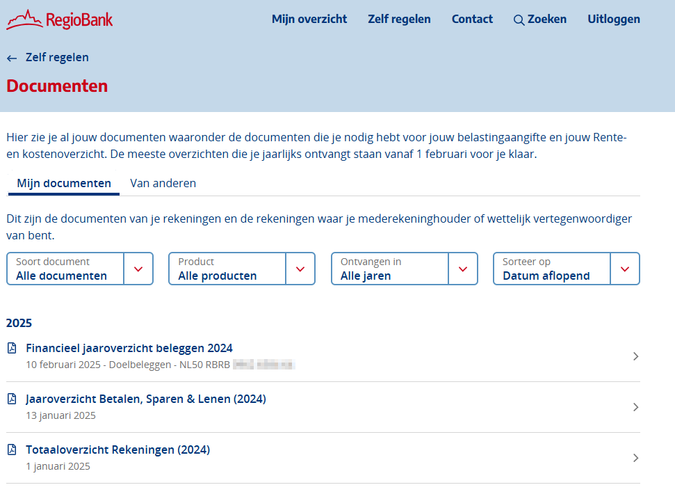 Hier zie je de documenten van de rekeningen waarvan je rekeninghouder, mederekeninghouder, wettelijk vertegenwoordiger of bewindvoerder bent.Van anderen