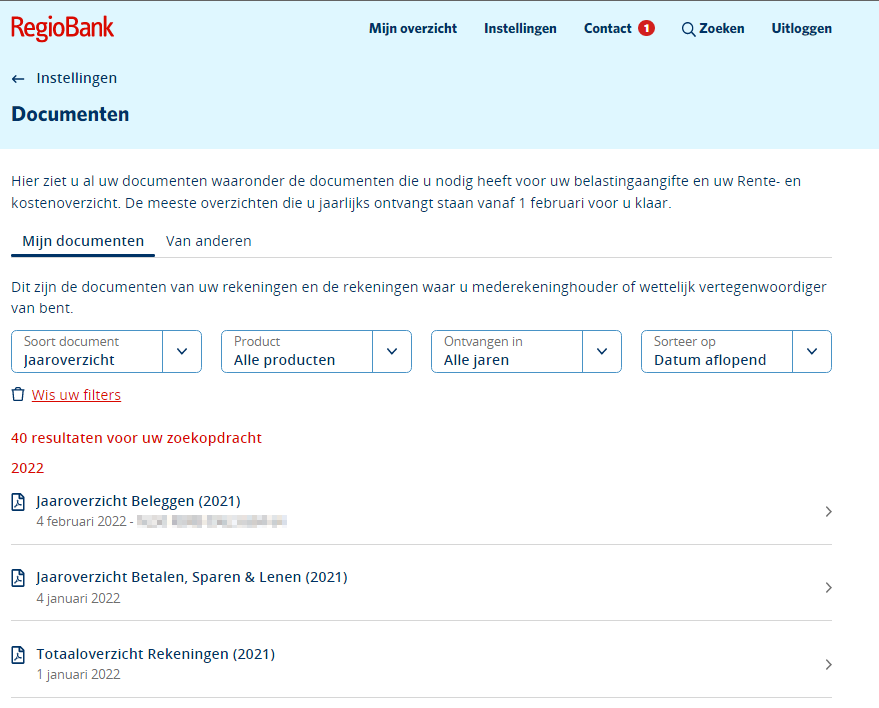 Let op: In de documenten met de naam 'Jaaroverzicht' zie je alleen de rekeningen waarvan jij rekeninghouder bent. Rekeningen waarvan je mederekeninghouder of wettelijk vertegenwoordiger bent, kun je terugvinden in het document 'Totaaloverzicht Rekeningen'.